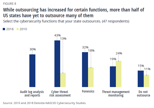 While outsourcing has proven effective in mitigating many of the factors articulated above, more than half of US states have yet to outsource crucial cybersecurity functions.